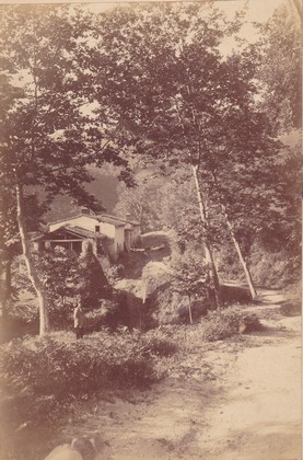 En esta foto observamos una cascada con casa a la derecha en un alto. La pose del hombre me hace pensar que sea el propio fotógrafo.